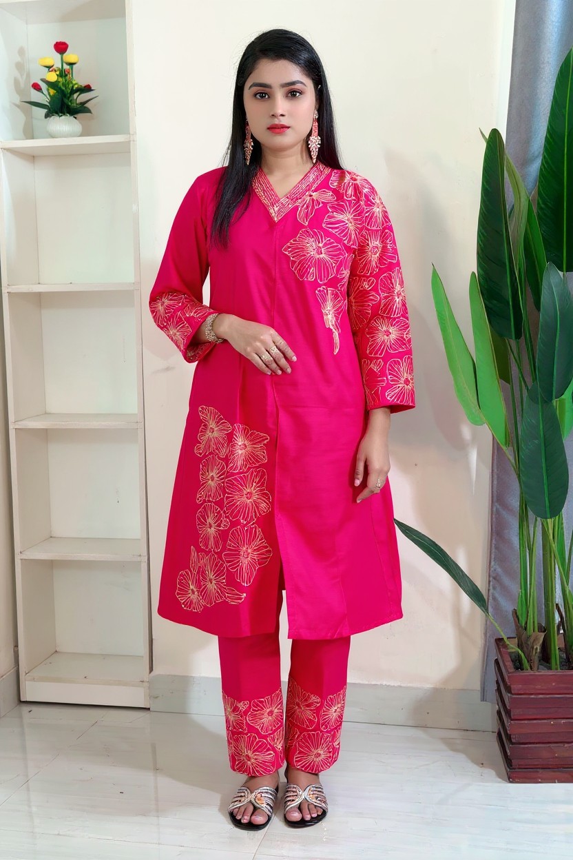 কামিজ: উজ্জ্বল ম্যাজেন্টা পিঙ্ক রঙের লিনেন কামিজটিতে সোনালী সুতোর নিখুঁত ফ্লোরাল এমব্রয়ডারি করা হয়েছে। লিনেন কাপড়ের নিজস্ব একটি আভিজাত্য বা 'টেক্সচার' থাকে, যা এমব্রয়ডারির কাজটিকে আরও ফুটিয়ে তোলে। কামিজের সাইড স্লিট এবং গলার কাজ একে আধুনিক লুক দিয়েছে।