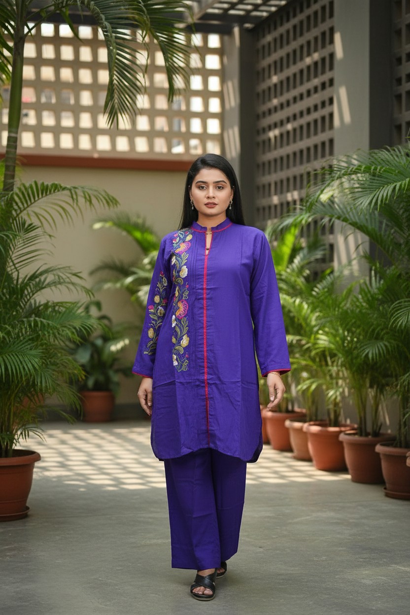 মার্জিত রুচি আর আভিজাত্যের সংমিশ্রণে তৈরি আমাদের নতুন ২ পিস সেট "বেগুনি আভা"। গাঢ় বেগুনি রঙের এই পোশাকটি আপনার প্রতিদিনের ফ্যাশনে যোগ করবে এক নতুন মাত্রা।